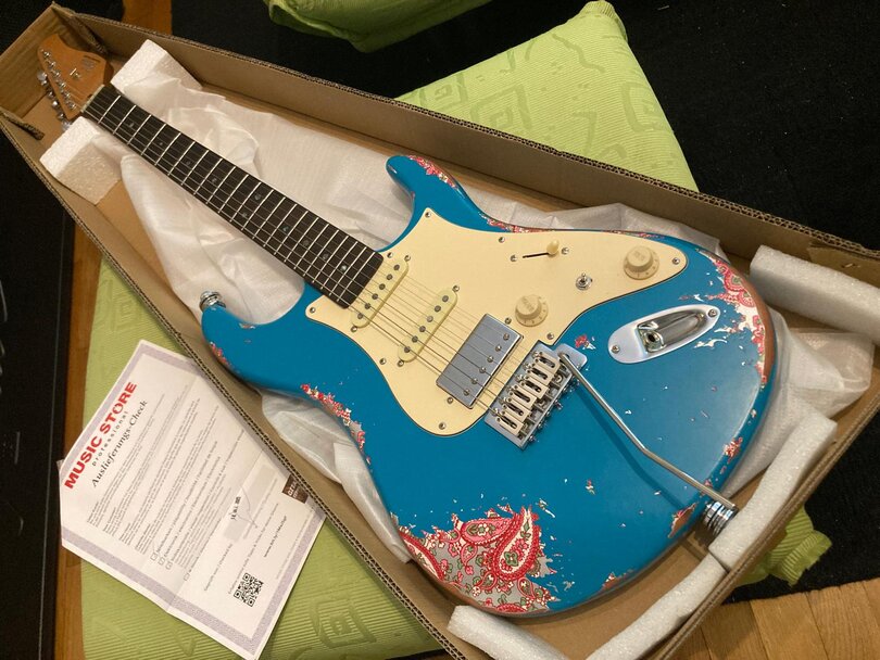 Fame Custom ST HSS RW Worn Aqua over Paisley, Mahagoni-Korpus, Quarter Sawn Ahornhals mit Palisander-Griffbrett (Modern "C"-Shape, 13,75" Radius), Sattelbreite 42 mm, Mensur 648 mm, 22 Jumbo Edelstahlbünde, Knochensattel, Chrom-Hardware, Die-Cast Locking Mechaniken, Vintage Tremolo, 1x Fame Humbucker (Bridge) + 2x Fame Single-Coils (Neck/Middle), Mini-Switch für Humbucker Coil-Splitting, 5-Way Switch, Volume+Tone Regler, Gewicht: 3,4 kg, Finish: Worn Aqua over Paisley-Nitrozellulose-Finish - in absolut neuwertigem Zustand! (inkl. Zertifikat & Rechnung von Music Store mit Restgarantie!) inkl. OVP - Detailfotos gerne auf Anfrage